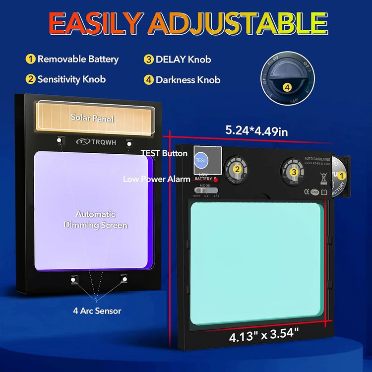 - کلاه ایمنی جوشکاری دارای تأخیر و حساسیت است ، می توانید مناسب ترین تنظیمات را برای کار خود مطابق با سناریوهای مختلف کار تنظیم کنید. DIN4 در حالت نور ، DIN5-9/9-13 در حالت تاریک. قدرتمندترین این است که کلاه ایمنی TRQWH دارای 4 سنسور قوس است که می تواند در 1/20،000 ثانیه از نور به تاریکی تغییر کند. فیلتر تاریک کننده خودکار از پوشش کریستال مایع با کیفیت بالا و روکش نوری ساخته شده است که می تواند در برابر 99 ٪ از نور مضر در برابر چشم ها مقاومت کند.