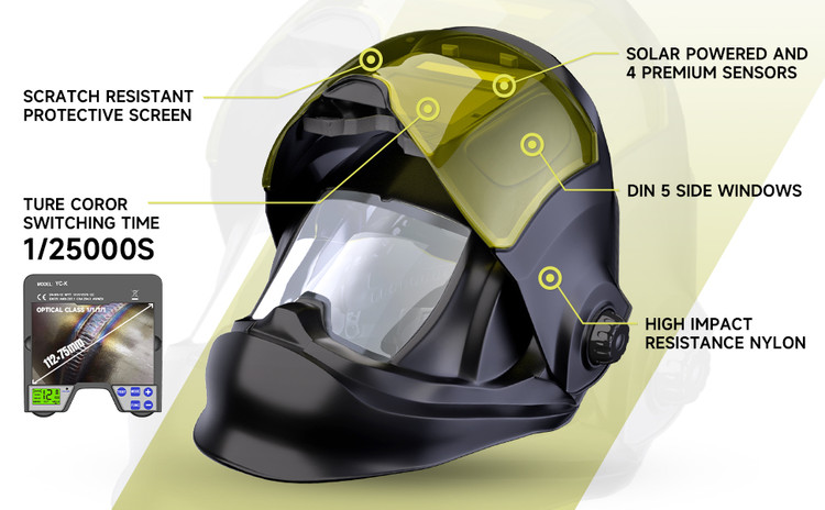 -4 حسگر برتر و انرژی خورشیدی: کلاه جوشکاری با انرژی خورشیدی همراه با یک کاوشگر بسیار حساس، 4 سنسور برتر. مناسب برای TIG MIG Arc، کاربردهای پلاسما با ویژگی سنگ زنی DIN5~9/DIN9-13 برای جوشکاری، برش و سنگ زنی.